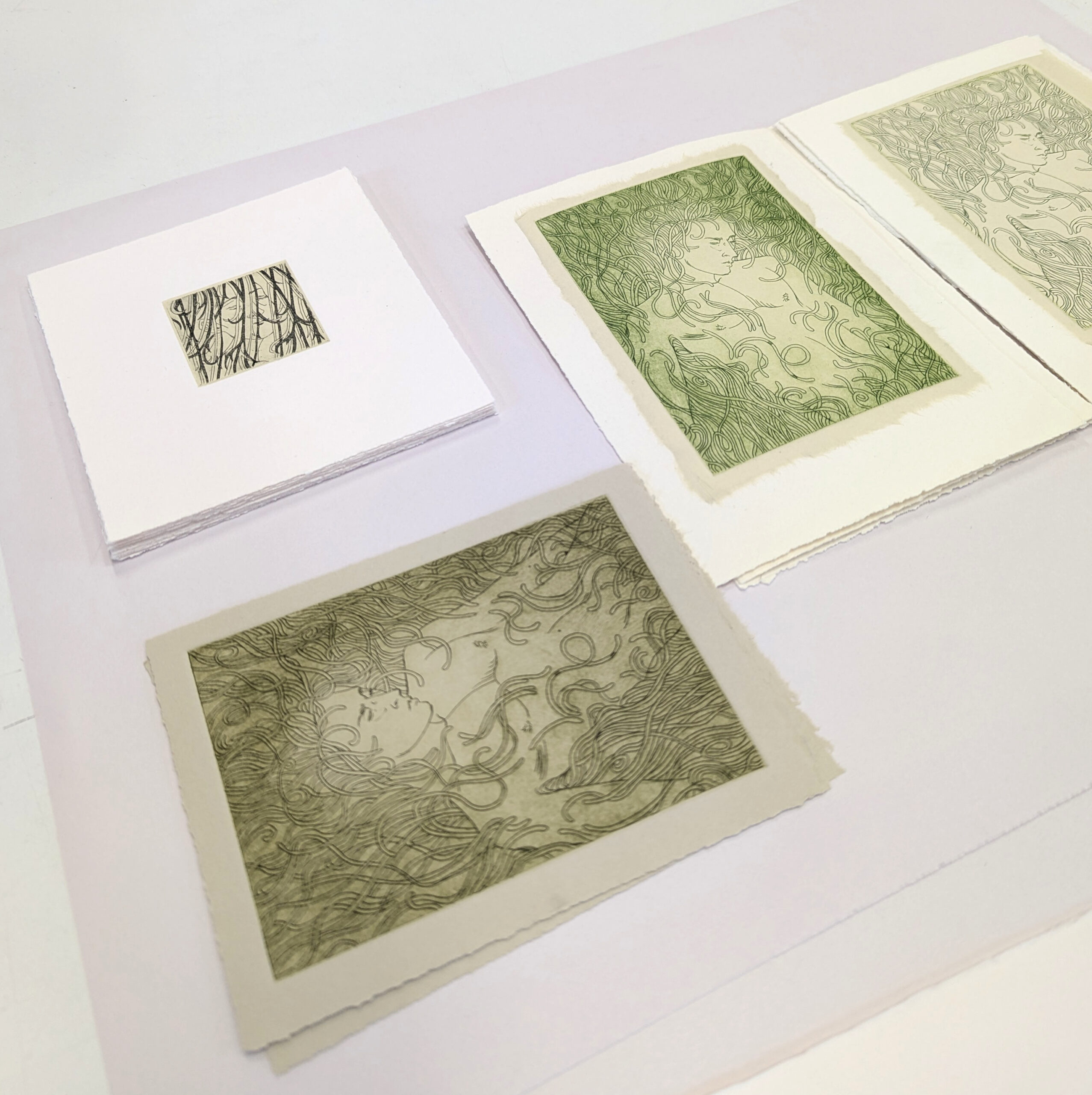 (Amy): For me, across making work for this exhibition I’ve been consistently informed by the particular quote by Rainer Maria Rilke that we chose as a group to base our proposal on. He speaks of embracing the broadness of existence and the unpredictability of life, and I hope that visitors experience my personal interpretation of that quote, to be drawn into these figures, where humanness is strange and intertwined with plant matter. While not necessarily immediately unpredictable, throughout working with these plates to create finalised images, I found myself in conversation with the plates themselves and the imagery upon them. They transformed in ways I hadn’t planned when I transferred them from original sketch to plate or when I pulled them off the press with adjustments to ink, inking technique and paper choices. I hope visitors are equally drawn into the exploratory, broad and unpredictable experience of making these prints.